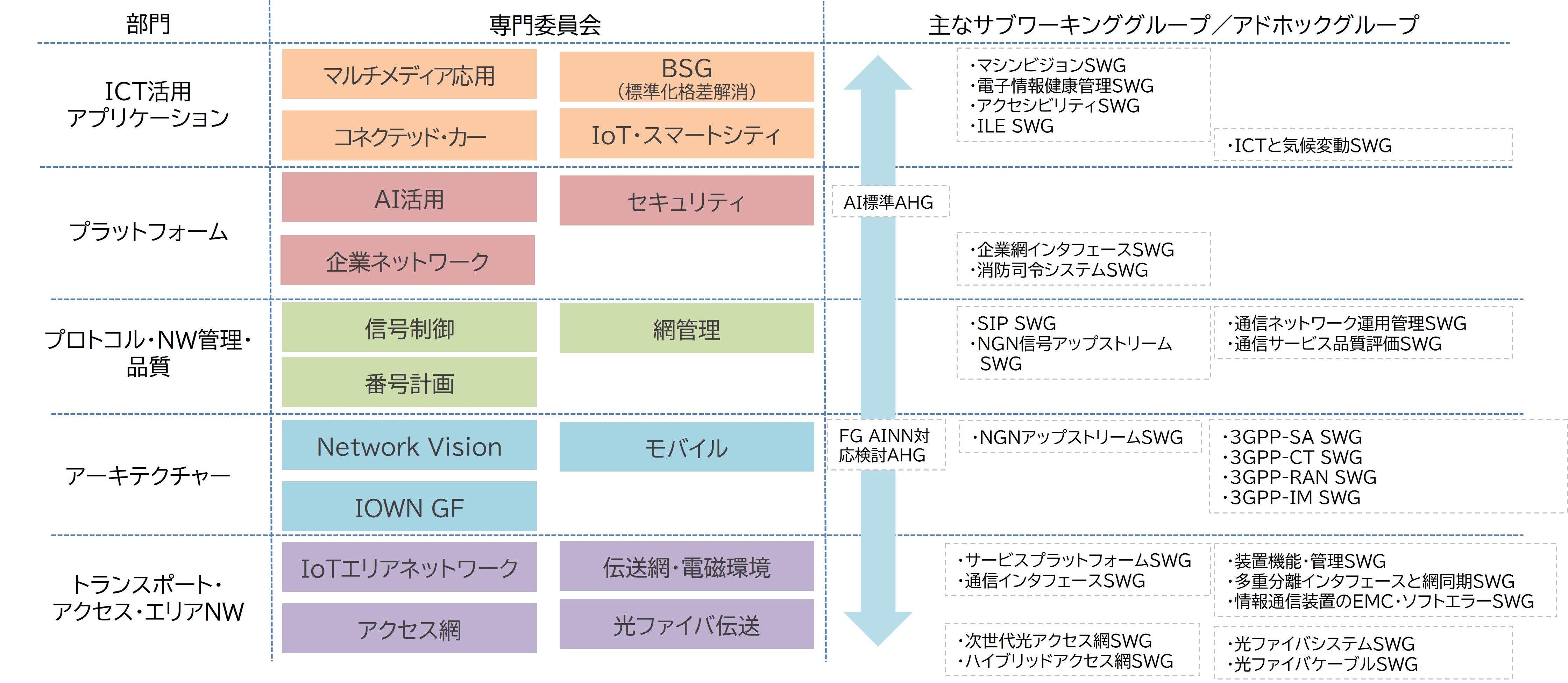 通信網のレイヤー構造に基づく5つの技術領域に対し、17の専門委員会があり、最新の技術分野・テーマについて情報収集を行うとともに、標準化に関連する議論を行っています。