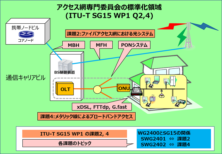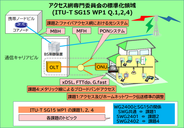 - ITU-T SG15/Q4へのアップストリーム活動に関しては、ハイブリッドアクセス網SWGが担当します。