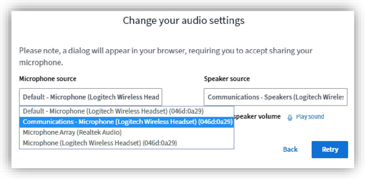 好みのオーディオデバイスを選択したら、「リトライ」をクリックしてマイクとスピーカーを再テストします。