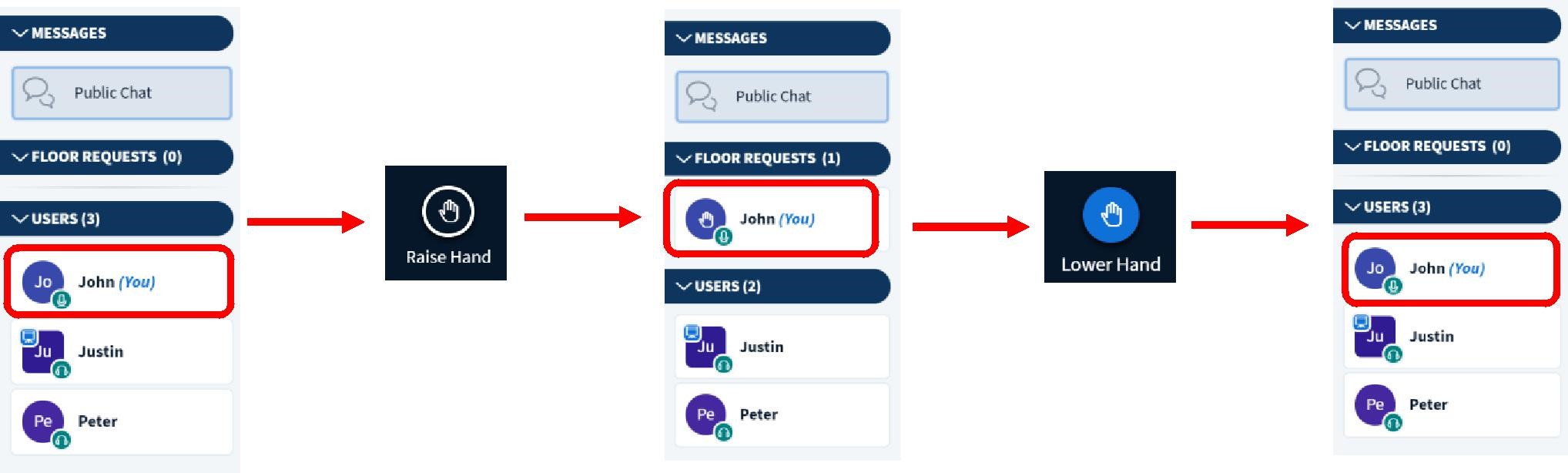 [手を挙げる] のオプションは、すべてのユーザが使用できます。発言権を要求するには、Raise Hand (手を挙げる) ボタンをクリックします。これにより、自動的に「フロア要求」のキューに入れられます。