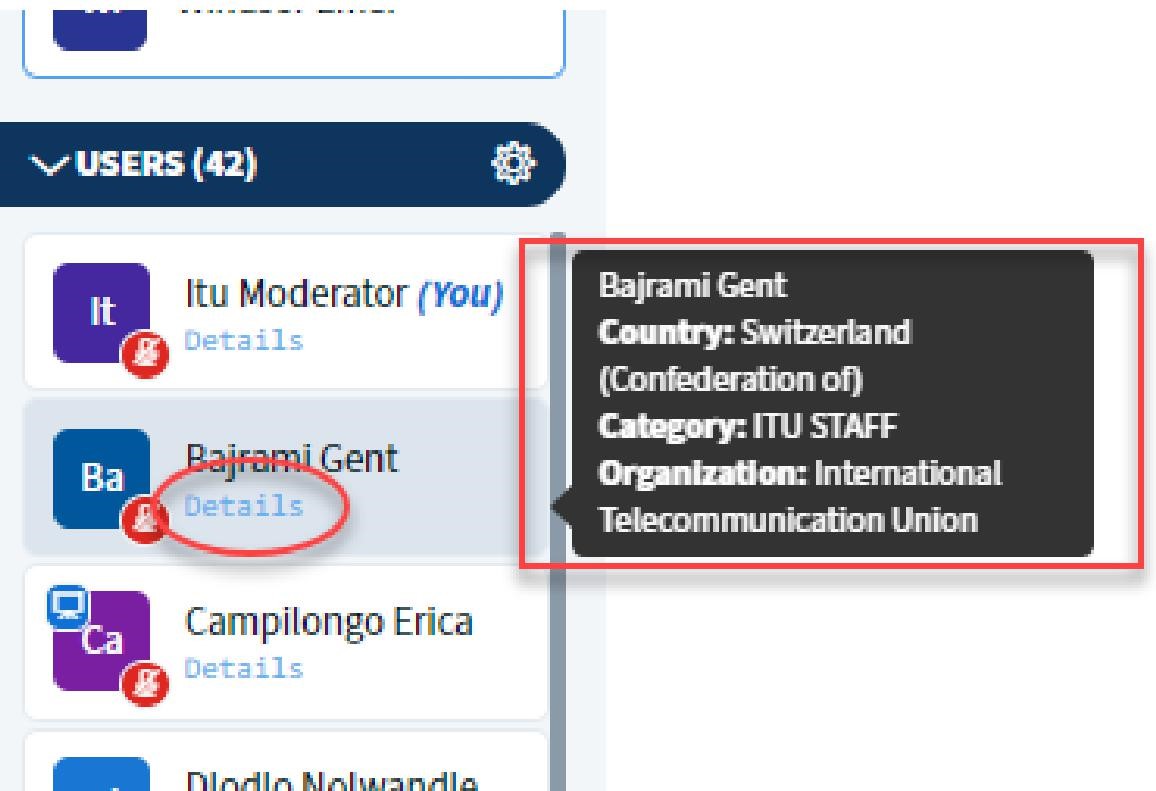 ユーザーの所属は、ユーザー名の下にある 「詳細」 ラベルにマウスを合わせると表示されます。完全な名前、国、会員分類、および組織が表示されます。