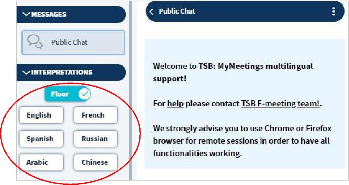 [通訳:Interpretation] 区画はメッセージ区画のすぐ下にあり、フロアチャネルから使用可能な任意の言語 (最大6つのITU公式言語:英語、フランス語、スペイン語、アラビア語、ロシア語、中国語) にリアルタイムで切り替えることができます。